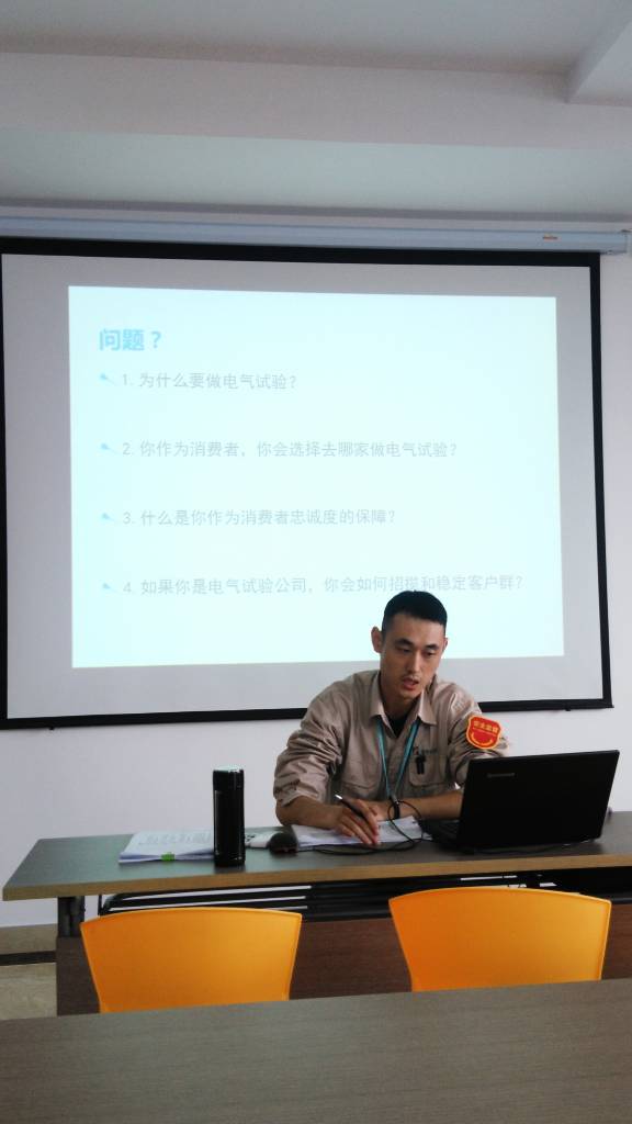 電試班組是公司重要的組成部門,是鑒定安裝工程安全性和正確性的最后把關(guān)部門,培訓(xùn)過程中分析了電氣試驗的重要性,就安全生產(chǎn)聯(lián)系客戶市場提出了系列發(fā)人深思的現(xiàn)實性問題,灌輸全體電試班組工作人員思想上重視安全、工作中遵規(guī)守紀(jì)、實操時循序漸進(jìn)、強(qiáng)化自身安全責(zé)任感的重要理念,培訓(xùn)中由電試班組領(lǐng)導(dǎo)程英就近期工作開展情況和電試業(yè)務(wù)的操作規(guī)范要求作了報告。